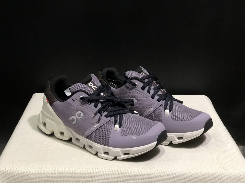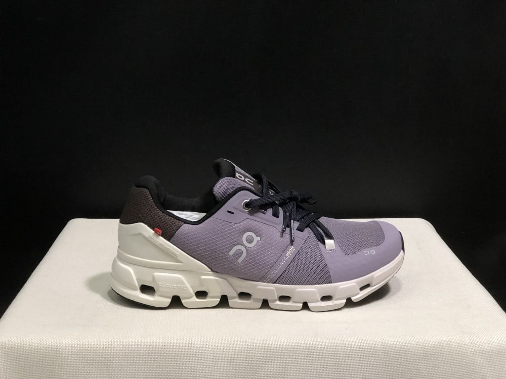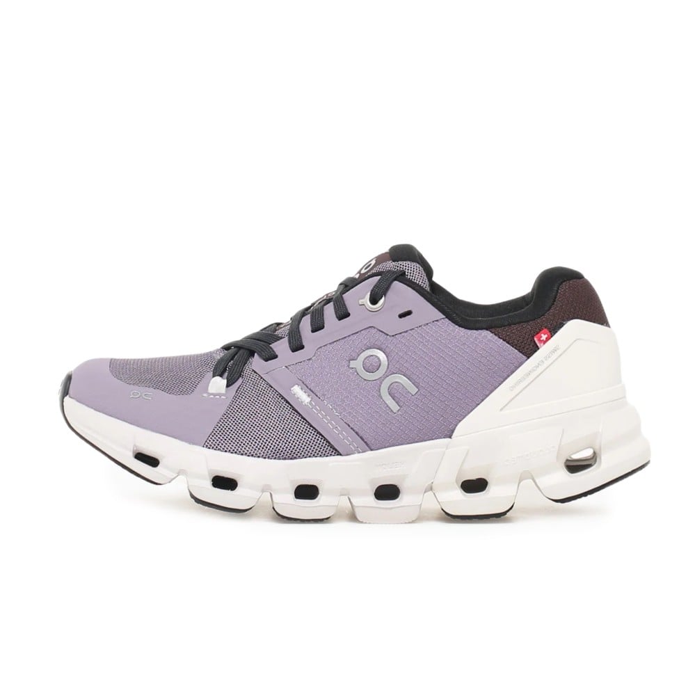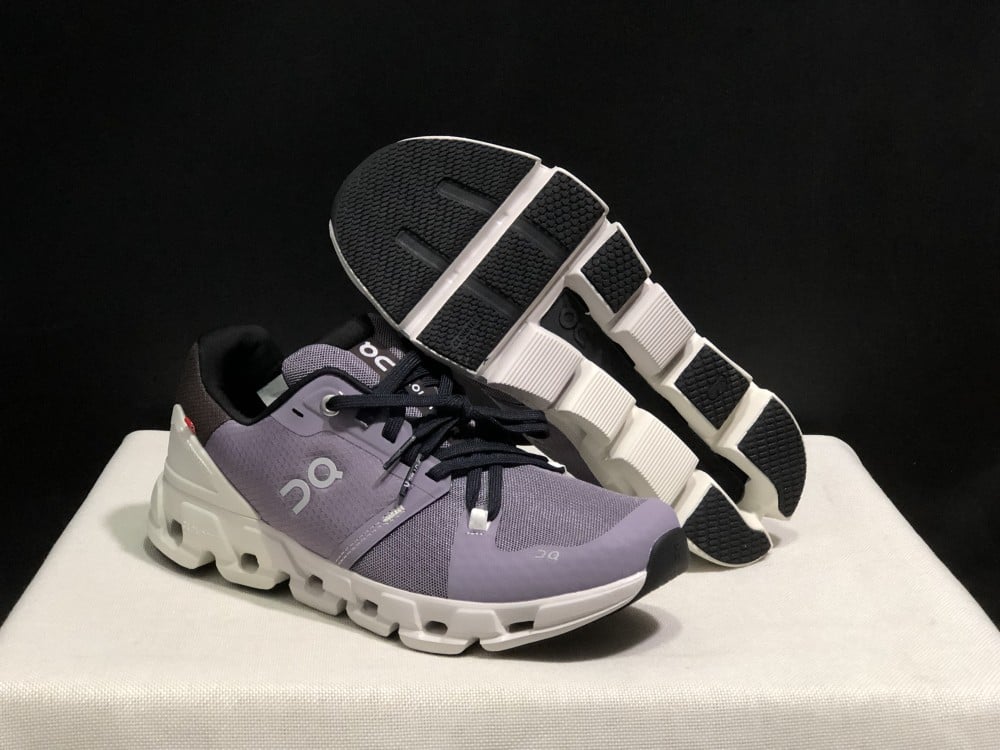 إليك وصف تفصيلي لحذاءOn Running Cloud Flyer باللونين اللافندر والأبيض: