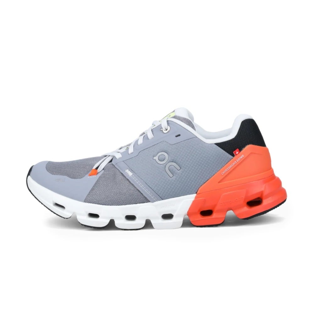 إليك وصف تفصيلي لحذاءOn Running Cloud Flyer باللونين الرمادي والبرتقالي: