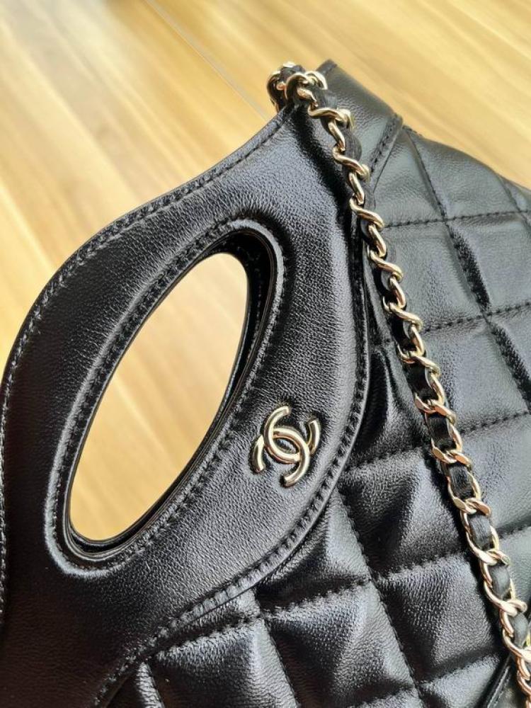 اللون الأسود الكلاسيكي للشنطة يجعلها قطعة سهلة التنسيق مع مختلف الإطلالات، بينما يضيف لوجو شانيل المعدني الأيقوني لمسة من الفخامة.
