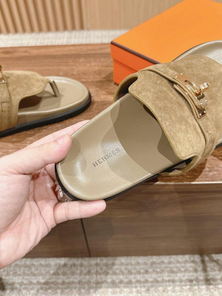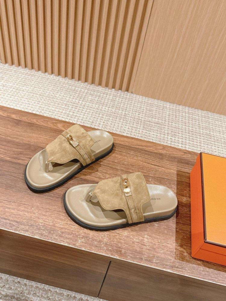 صندل إيرميز البيج المريح بتصميم الإصبع هو ترجمة أنيقة للبساطة الفاخرة التي تتقن فن الراحة دون أن تتخلى عن الذوق الرفيع.