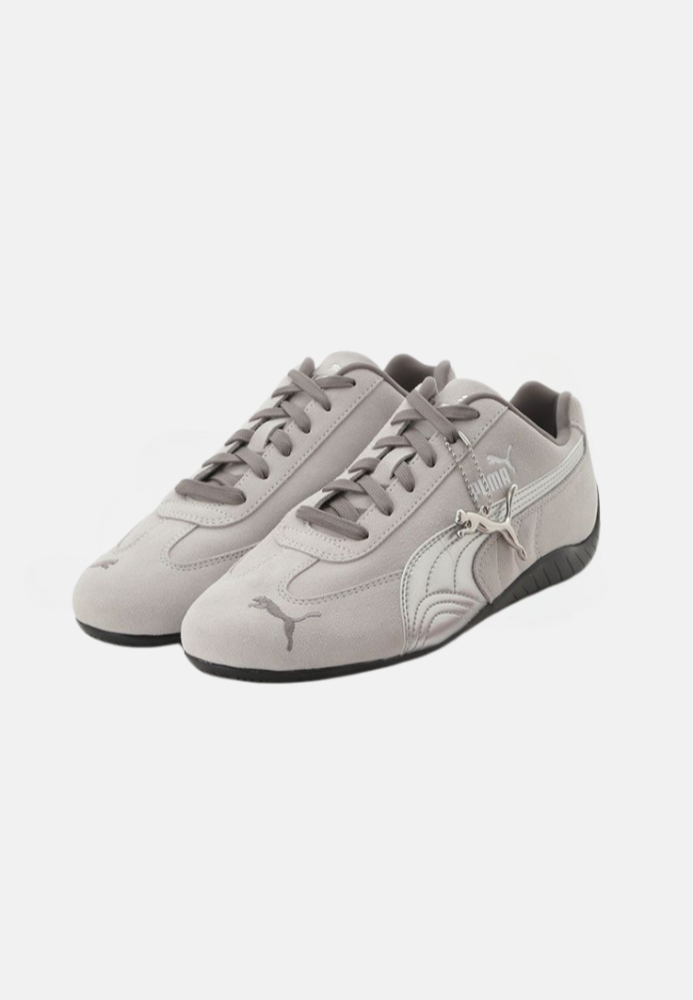 يتميز حذاء بوما سبيد كات بتصميم يجمع بين اللون الرمادي الهادئ واللون الفضي اللامع، مما يمنحه مظهرًا عصريًا ومستقبليًا. الحذاء مصنوع من الجلد الشمواه الناعم والمريح، بينما تبرز الخطوط الجانبية المصنوعة من المعدن الفضي اللامع.